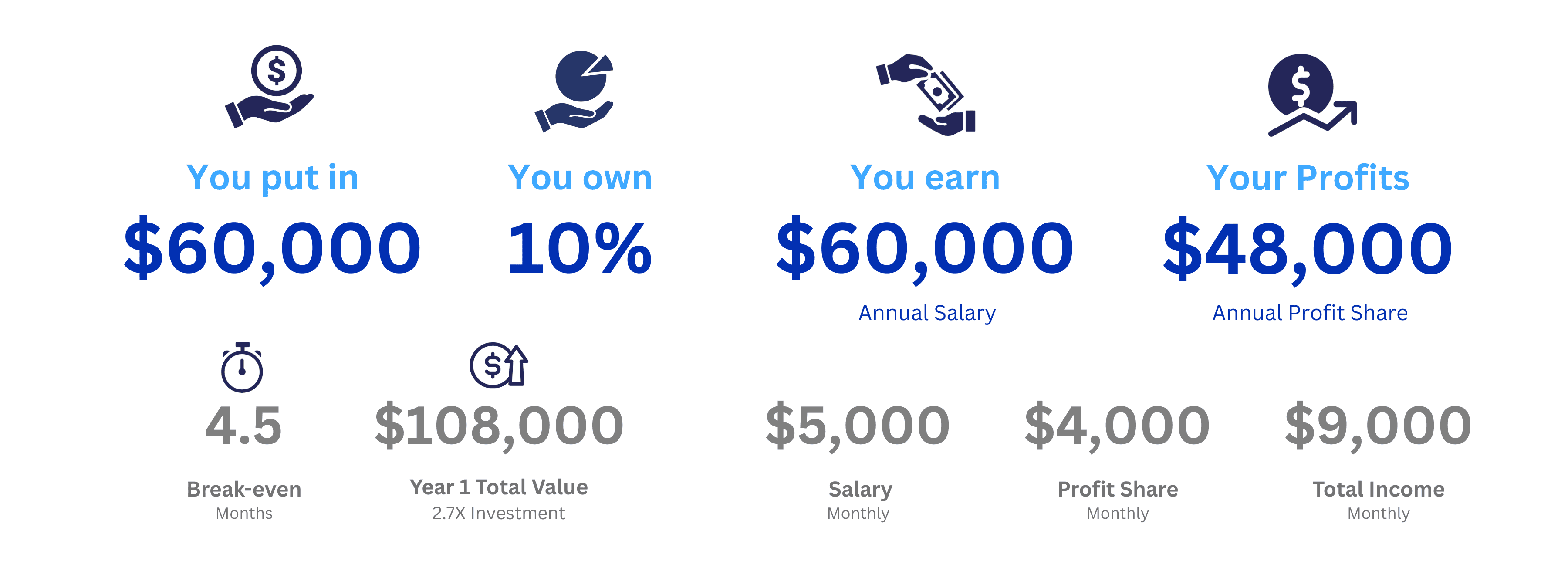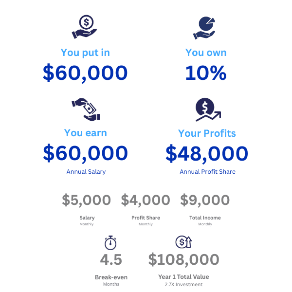 ✔ With 10% ownership, you can earn ~$110,000 via salary & profit-sharing.